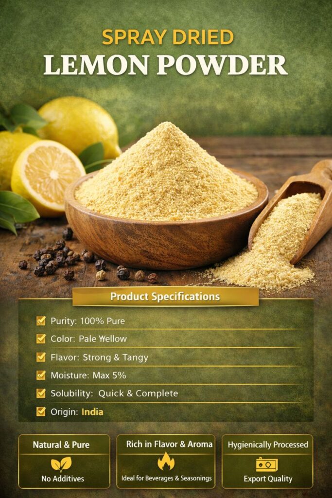| Lemon Powder | Pale Yellow | ≤ 4% | Excellent | Fine / 80 mesh | 12 months | 25kg / 50kg HDPE bags |
