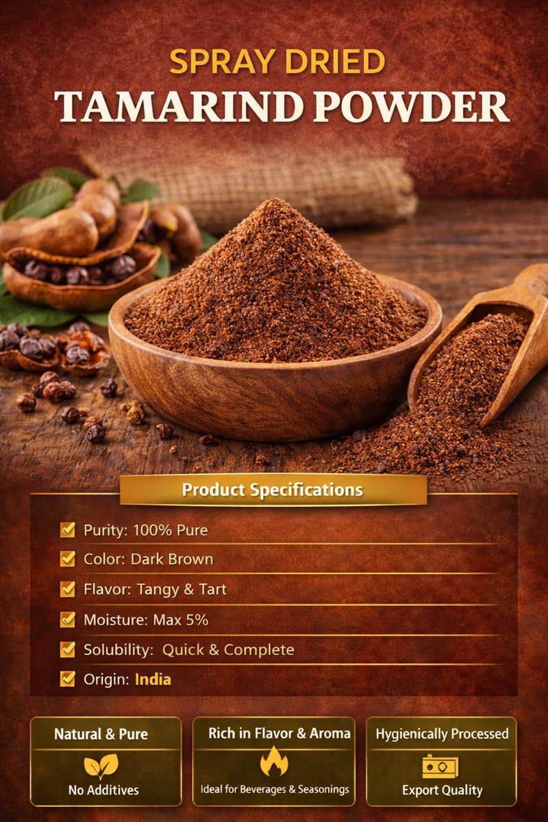 | Tamarind Powder | Brown | ≤ 6% | Good | Fine / 60–80 mesh | 12 months | 25kg / 50kg HDPE bags |
