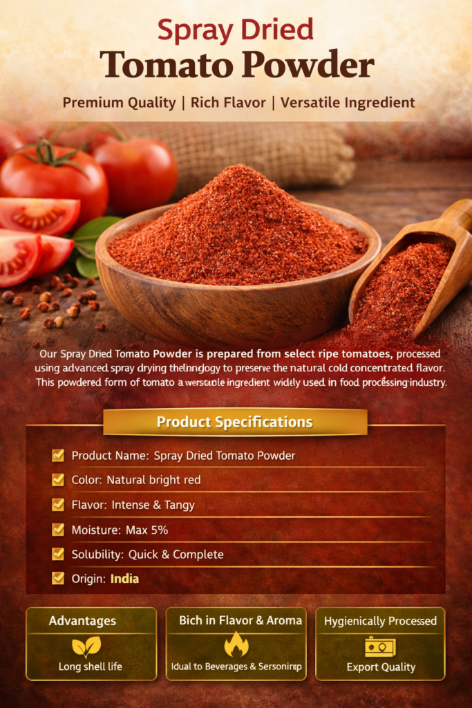 Premium spray dried tomato powder processed from fresh tomatoes. Rich natural color, tangy flavor, and excellent solubility. Ideal for sauces, soups, seasonings, and export applications.